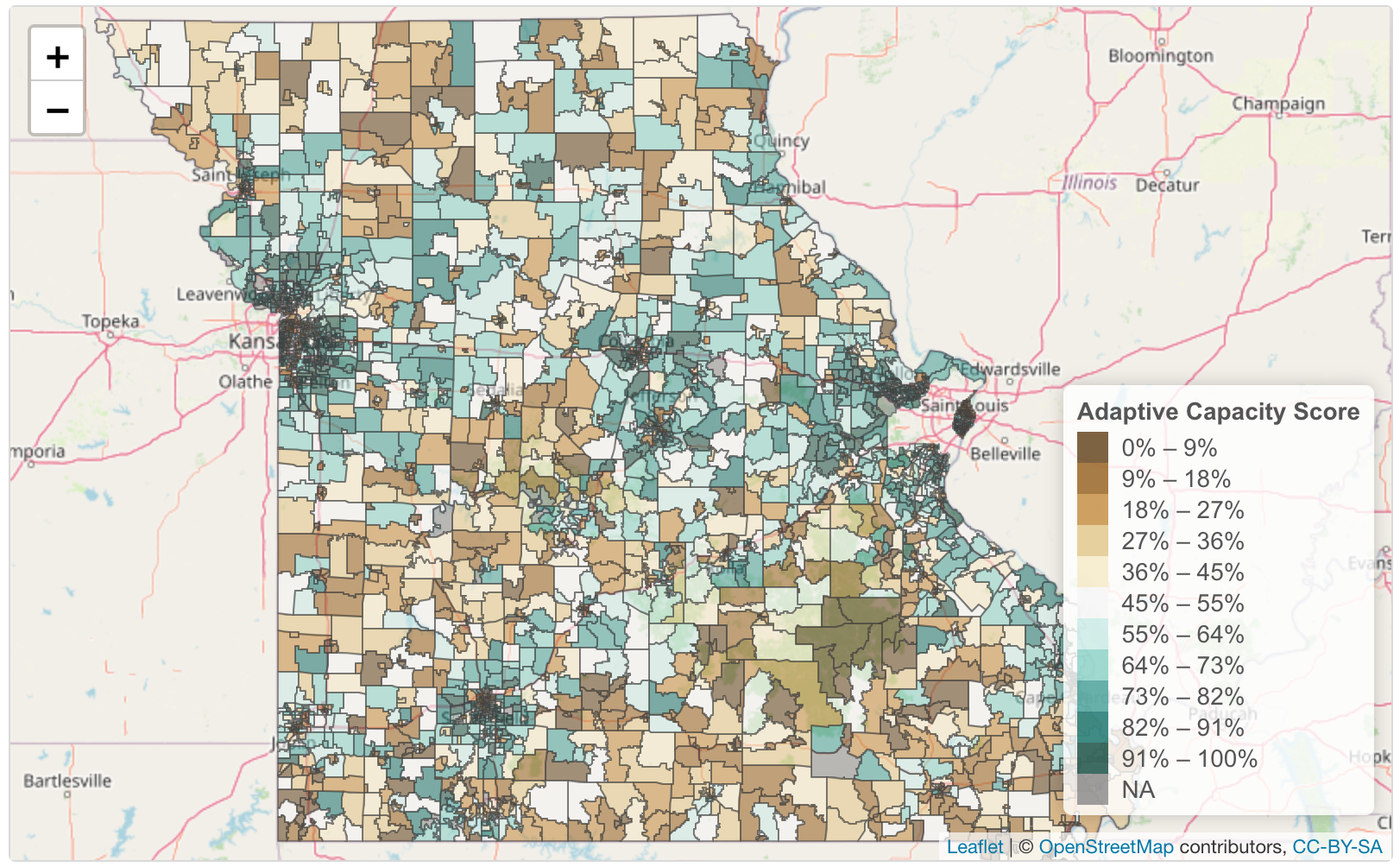 This “adaptive capacity index” was based on existing research and created by Missourian data analyst Han Vu. The index uses the following measures to create an adaptive capacity percentage. The higher the percentage, the less vulnerable an area is to threats. You can click on any area in the map to read that community’s measures on a series of key factors: